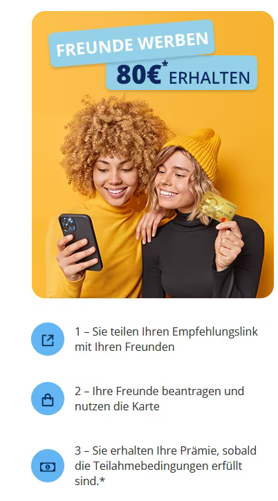 Ayrıca davet bağlantısı ile kart talep ettiğinizde hem davet eden kullanıcı hemde yeni kart alan kullanıcı hedize bakize kayanmaktadır. Suan mevcut kampanyada 80 euro wilkommen borusu alabilirsiniz;